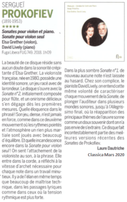 «La beauté de ce disque réside sans aucun doute dans la sonorité crépitante d’Elsa Grether. La violoniste française possède une identité sonore, un jeu racé avec de la rondeur. Quelle éloquence dans le phrasé! Son jeu, dense, n’est jamais en force (…) et quelle incandescence encore dans la sonate pour violon seul! (…) Ce disque fait incontestablement partie des meilleures versions récentes des Sonates de Prokofiev»